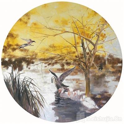 青頭潛鴨又飛回來了(油畫)張廣軍作