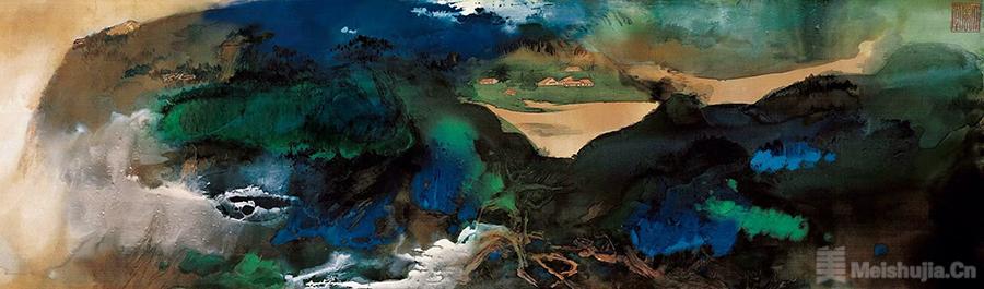 張大千以金碧山水畫的色彩體系融合水墨山水、潑墨、抽象等技法語言,形成既保留“氣韻、意境”傳統美學,又具現代表現質感與視覺沖擊的新型山水畫語言——潑彩山水。潑彩山水以大面積石青、石綠為主調,搭配朱砂、珍珠白、墨、赭石等顏色,以大面積色塊、潑灑、暈染的隨機性來構建山水空間的遠近、云霧與光影層次,形成豐富而高雅的視覺效果。其代表作品《愛痕湖》《長江萬里圖》氣勢雄偉、境界空靈而開闊,融潑彩、潑墨、勾皴技法于一體。潑彩山水既能表達山、水、云的氣韻,又能讓色彩在畫面上流動,形成動態、色彩自由、表面質感多維的表達路徑,擴展了金碧山水畫在現代美術創作中的視覺語言。